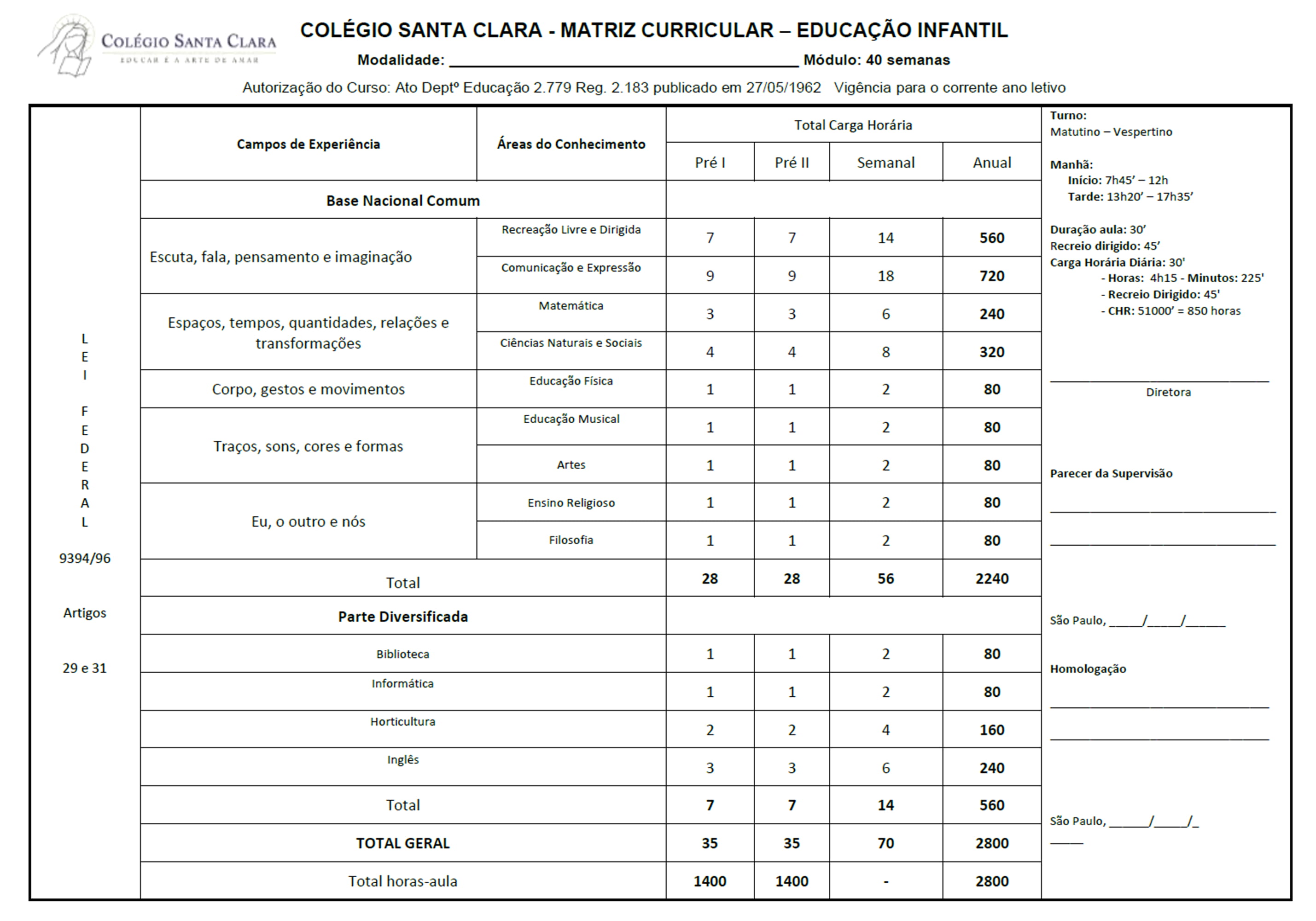 • Em termos qualitativos e quantitativos, nossa matriz curricular amplia as exigências legais quanto à carga horária e às disciplinas, de acordo com a nossa preocupação na formação de sujeitos ativos, questionadores, sensíveis e transformadores da realidade de seu tempo. Nesse sentido, a grade curricular apresenta uma flexibilidade e uma abrangência que traduzem nossa intenção de instrumentalizar os educandos a acompanhar as constantes exigências do mundo contemporâneo.