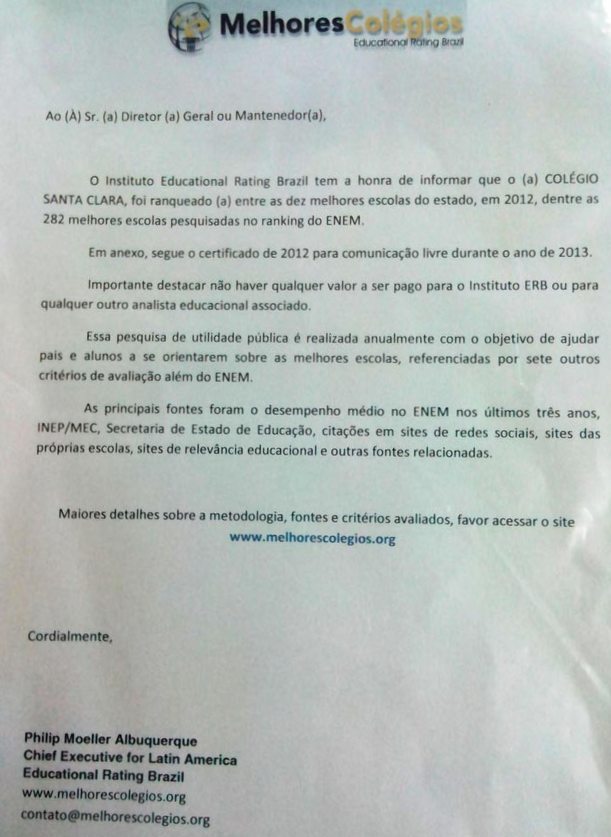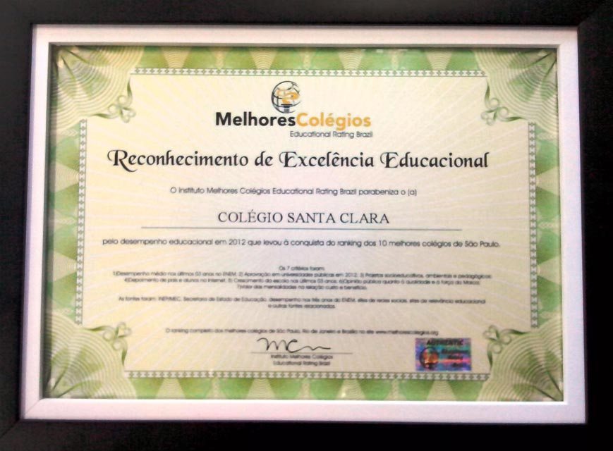 O Colégio Santa Clara agradece o reconhecimento pela busca da melhor qualidade para o trabalho pedagógico e parabeniza a todos, que não medem esforços, para que esse objetivo seja sempre almejado idealmente e atingido concretamente!